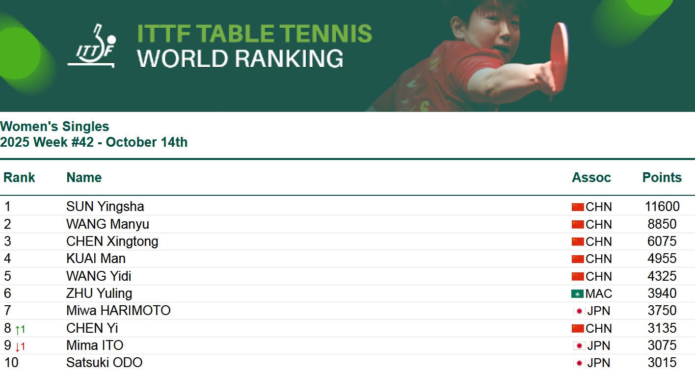 10月14日,国际乒联更新了2025年第42周世界排名。女单方面,孙颖莎以11600分连续170周排名第一,王曼昱以8850分排名第二,陈幸同以6075分排名第三。男单方面,王楚钦以10900分排名第一,林志东以8075分排名第二,雨果以6050分排名第三。