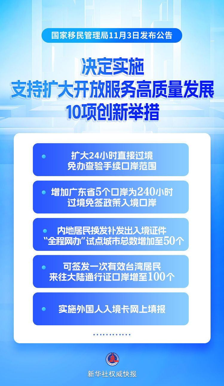 国家移民管理局3日宣布,决定推出10项创新举措,支持扩大优质开放服务发展。六项措施将于2025年11月5日起实施: 扩大往返港澳人才签证试点政策范围。大陆居民赴台探亲签证将实行“全民服务”。推动通航通港澳台的部分口岸智慧通关应用。支持深港环线科技创新合作区深圳园区促进生产要素跨境高效流动。扩大不需要24小时越库检验的口岸范围。新增广东省5个口岸为240小时过境免签政策入境口岸。 2025年11月20日起实施四项措施:扩大内地居民入境证件变更补发“全程网上办理”试点城市范围;为持探亲签证往返香港、澳门的内地居民续办香港、澳门同类型探亲签证提供便利。扩大可为台湾居民发放一次性大陆通行证的口岸范围,实行外国人网上入境卡记者:任勤勤、雄风海报制作:贾希全、新华社制作 Copyright © 2024-2026 51今日大瓜每日大赛 暗黑吃瓜官网入口大揭秘 版权所有